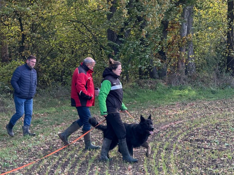 Anschließend stand die Rettungshunde-Suche auf dem Programm. Hier zeigten unsere Teams, was echtes Vertrauen bedeutet: Dirk Opitz mit Arani und Axel Landenberger mit Django von Oberschwaben („Charly“) fanden die versteckte Person sicher und erhielten 78 bzw. 82 Punkte.