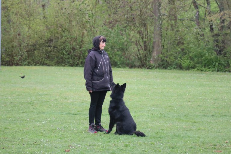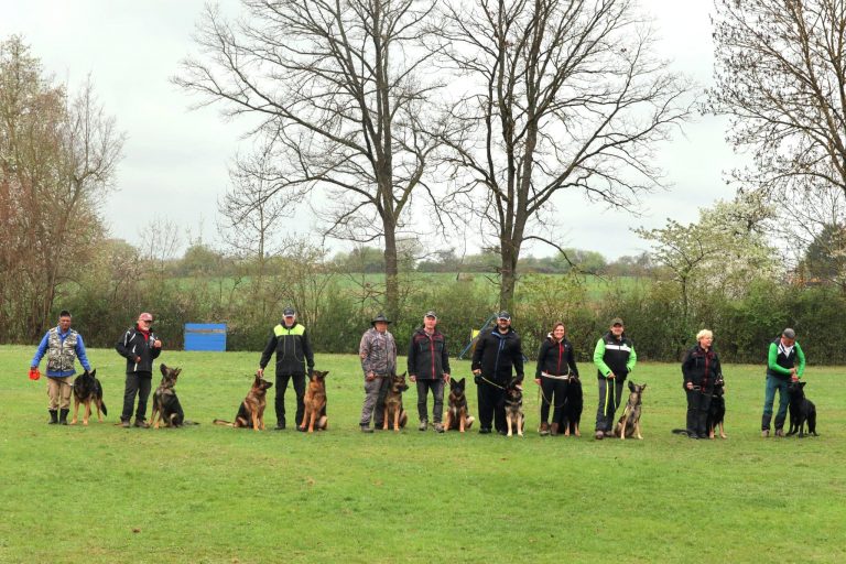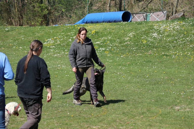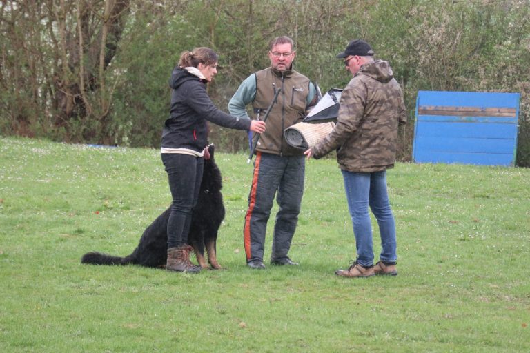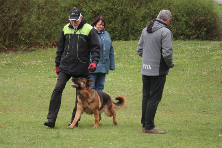 Auf dem Vereinsgelände ging es anschließend mit den Begleithundeprüfungen weiter. Roland Benz bestand mit Dai Dai vom Rolben souverän sowohl Unterordnung als auch Verkehrsteil. Weniger Glück hatten Stavros und sein Rüde Paris, der sich von Schüssen des benachbarten Schützenvereins stark beeindrucken ließ – die Prüfung musste abgebrochen werden.
