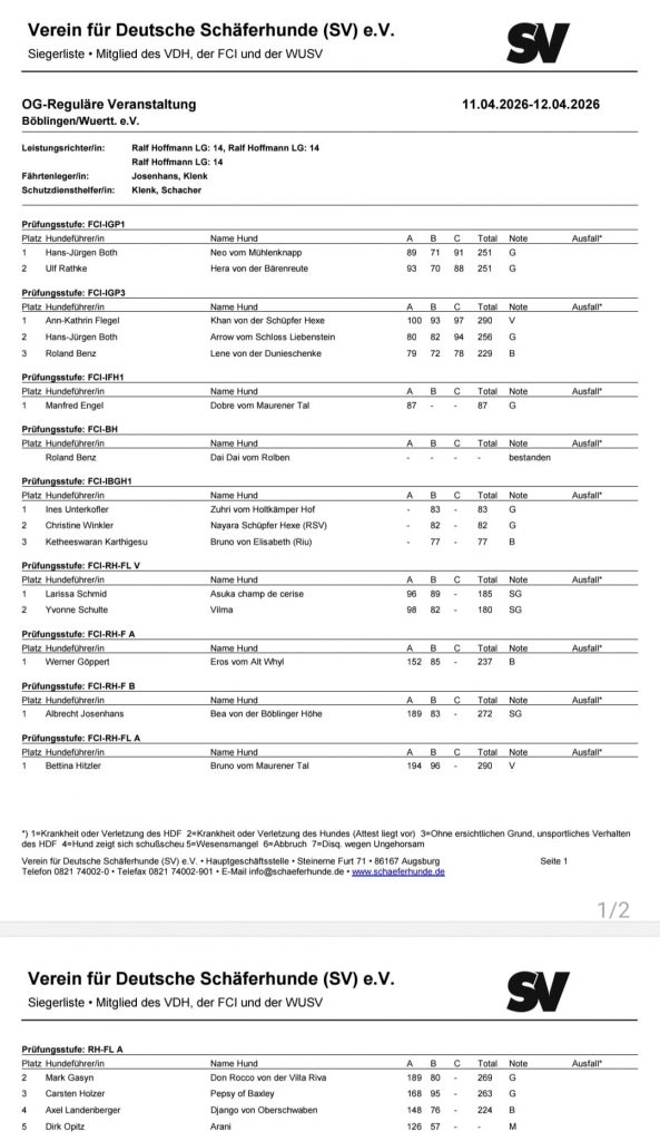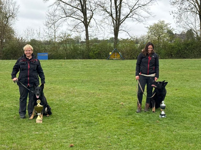 In der Prüfungsstufe V erreichten Larissa mit Asuka 89 Punkte und Yvonne mit Wilma 82 Punkte. In der Stufe A setzten sich Bettina mit Bruno mit 96 Punkten an die Spitze, dicht gefolgt von Carsten mit Pepsy (95 Punkte). Werner mit Eros kam auf 85 Punkte, Mark mit Rocco auf 80 Punkte. Axel und Charly mussten sich nach einem kleinen Patzer des Hundeführers mit 76 Punkten zufriedengeben. In der höchsten Prüfungsstufe B zeigte Albrecht mit Bea eine ansprechende Arbeit, die mit 83 Punkten bewertet wurde – ein Fehler in der Ablage kostete jedoch wertvolle Zähler.