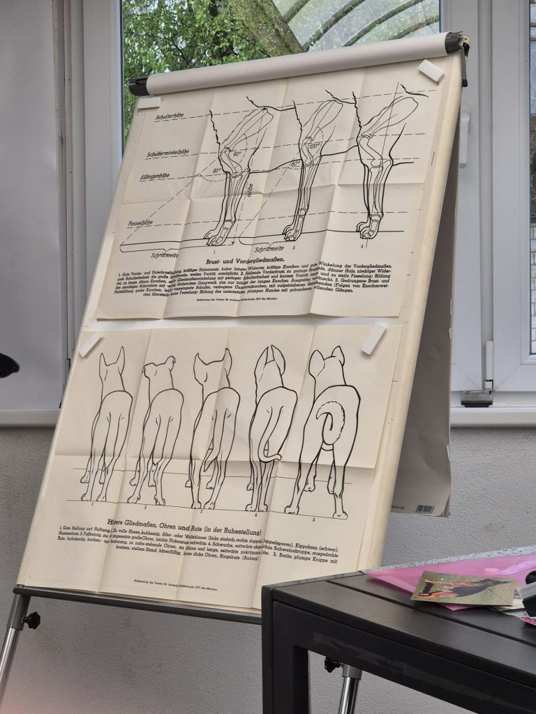Den Abschluss bildete der praktische Teil: Die Teilnehmer aus Böblingen sowie ihre Gäste präsentierten ihre Hunde, die gemeinsam fachgerecht gestellt und anhand der zuvor besprochenen Anatomie beurteilt wurden. So konnte das Gelernte direkt angewendet und vertieft werden.